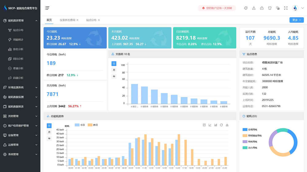 能耗分析中是对数据的图形、图表展示,其中包括用能统计、用能报表、排名分析、同比分析等功能。它可以分支路、分类、分项、分区域、分部门统计用能信息,查看能耗报表,用能同比分析,并进行差值分析与能耗排名分析。使得管理人员对能耗数据信息清晰明了,为节能降耗提供数据支持。
